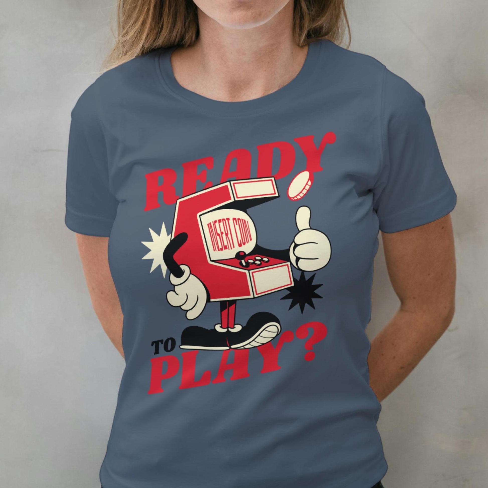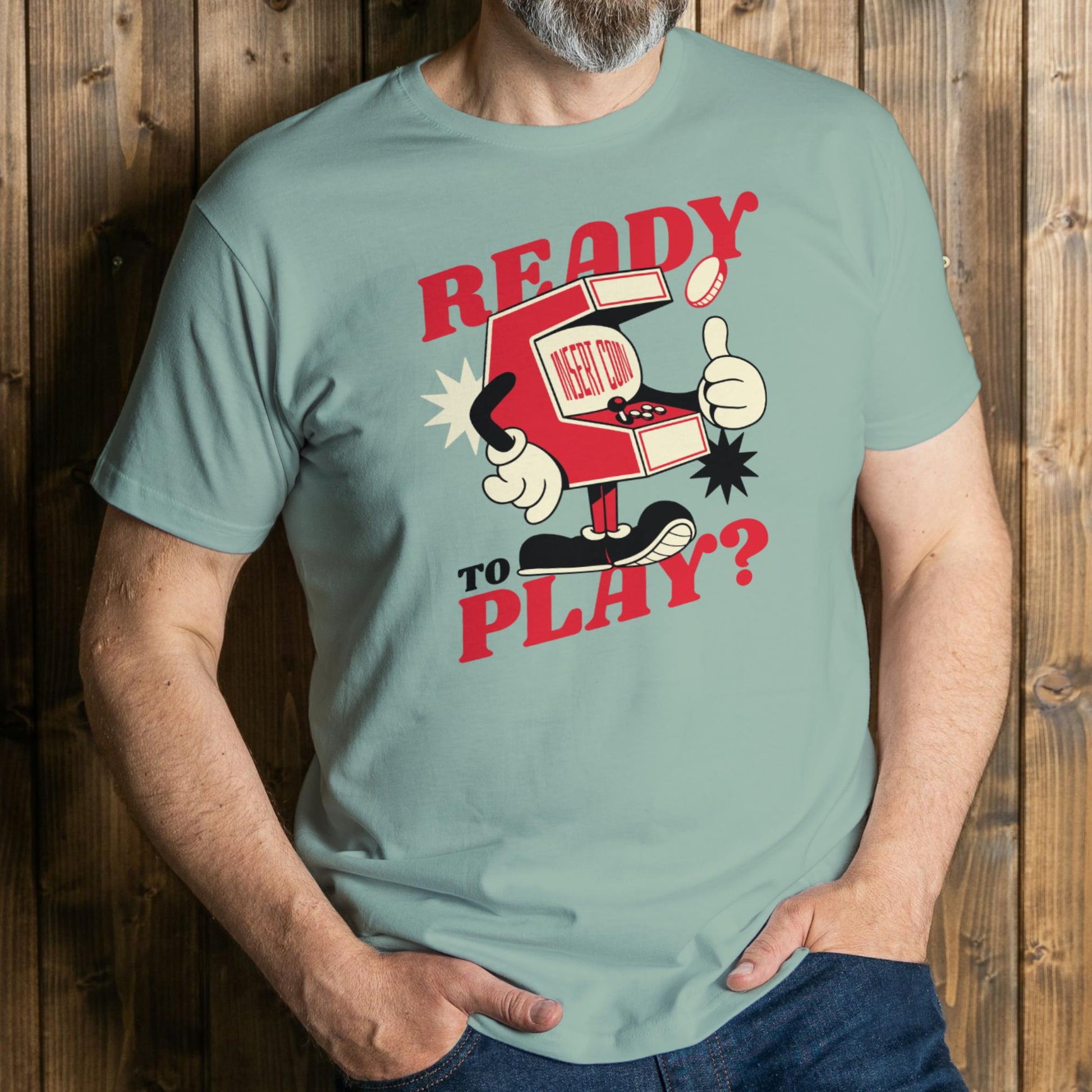 Level up your wardrobe with this throwback arcade classic! The Ready to Play? t-shirt features a bold vintage cabinet character in red and cream, giving major 80s coin-op vibes. With cartoon gloves, classic joystick art, and an inviting “Insert Coin” callout, this tee is a nostalgic blast for old-school gamers and pinball wizards alike.