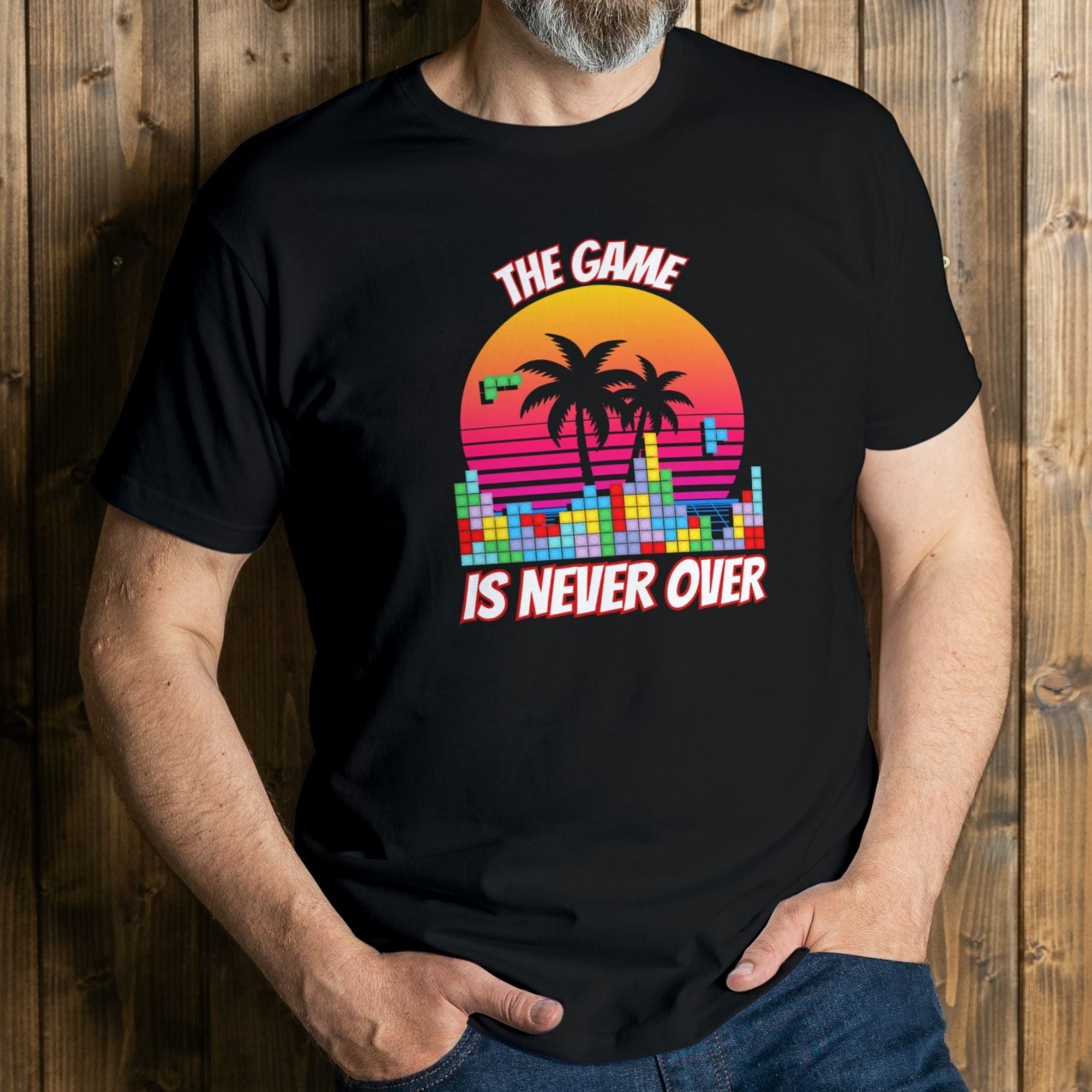 Funny how addictive fitting colorized blocks in more blocks to make them disappear became so addictive. This game is never over t-shirt has never been more apt. A graphic tee to last through the ages.